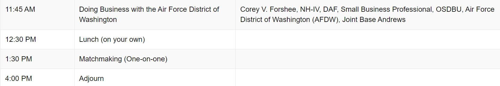Access to federal agencies and prime contractors and the opportunity to meet one-on-one with Agency and Prime Acquisition Representatives (scroll to the bottom of the page to see the list of agencies and prime contractors who have confirmed)